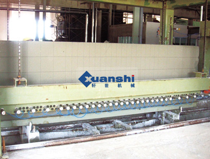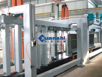 (2)坯體行走:預(yù)養(yǎng)好的坯體帶?罩蟹D(zhuǎn)90度,然后將坯體放在切割小車上或輥道上,由脫模機(jī)構(gòu)脫去?。坯體通過小車或輥道行走進(jìn)行水平切割,切割好后坯體繼續(xù)前行至橫切位置定位,進(jìn)行橫向切割,切割好后前行由行車吊走坯體。
