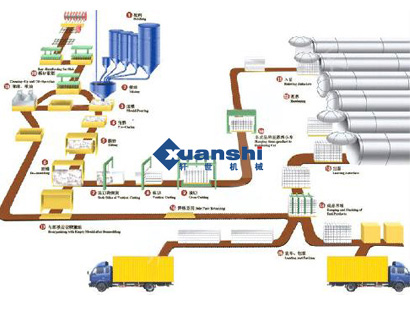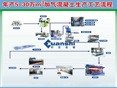 首先將貯存的原材料經(jīng)計(jì)量配料(1)后進(jìn)入澆注攪拌機(jī)內(nèi),經(jīng)攪拌(2)均勻后澆注溫度和時(shí)間的預(yù)養(yǎng)(4)坯體達(dá)到一定硬度后,由翻轉(zhuǎn)吊具把模具和坯體吊至切割機(jī)上。翻轉(zhuǎn)吊具完成下列功能:a把模具在空中作90度翻轉(zhuǎn)(5)(模具的一側(cè)板成為支承坯體的底板直至蒸養(yǎng)出成品),b吊運(yùn)載小車或切割支撐架上完成開模、脫模(6),c脫下的?蚝头祷氐恼麴B(yǎng)側(cè)板(16)再重新組合成模具(17)等待清理后噴油(18)重新澆注。坯體在切割機(jī)上分步作六面切割;a首先進(jìn)行坯體兩側(cè)面垂直切割(7),b然后進(jìn)行縱向水平式切割(8);c最后進(jìn)行橫向水平式切割(9)。切割好的坯體由半成品吊具連同底板吊至蒸養(yǎng)小車(10),然后編入蒸壓釜(11)進(jìn)行高溫蒸養(yǎng)(12),蒸養(yǎng)好后出釜(13),由成品吊具將成品堆垛(14)或裝車、打包(15)蒸養(yǎng)側(cè)板則返回。(16)加氣混凝土生產(chǎn)設(shè)備裝備:加氣混凝土生產(chǎn)設(shè)備的選型和數(shù)量根據(jù)工藝設(shè)計(jì)方案而確定,根據(jù)工藝設(shè)計(jì),澆注分為固定式和移動(dòng)式兩種澆注,切割方式目前國(guó)內(nèi)以翻轉(zhuǎn)切割為主,其它配料系統(tǒng)、蒸壓養(yǎng)護(hù)等設(shè)備都大同小異。