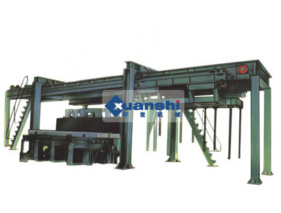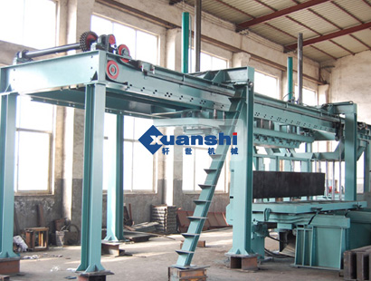 模具內(nèi)預(yù)養(yǎng)好的坯體,由定點(diǎn)行車將加氣混凝土坯體吊到翻轉(zhuǎn)臺上,脫掉?,操作控制系統(tǒng), 指令液壓機(jī)構(gòu)將翻轉(zhuǎn)臺翻轉(zhuǎn)90°,由縱向水平切割機(jī)構(gòu)行走完成切割動作,再由橫切機(jī)構(gòu)自上而下擺切割動作完成上升到原位完成一次切割周期。