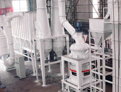 該 機(jī)工作原理與R系列雷蒙磨粉機(jī)相同。但在碾磨裝置中設(shè)置了高壓彈簧,使節(jié)磨輥與磨環(huán)之間碾壓力提高1.2倍。當(dāng)磨輥與磨環(huán)達(dá)到一定磨損后,通過調(diào)整高壓彈 簧長度,使磨輥環(huán)之間保持恒定碾壓力,以保證質(zhì)量穩(wěn)定。同時在碾磨裝置中,各零部件經(jīng)過技術(shù)改進(jìn),使磨輥與磨環(huán)的接觸面積達(dá)到最大,避免了一般磨粉機(jī)中, 小顆粒物料在凹凸不平的縫隙中不能連續(xù)粉碎的現(xiàn)象。 根據(jù)氣體流動的柏努里方程計算及模擬實(shí)驗結(jié)果,改變了細(xì)度分級機(jī)中葉片的幾何形狀,重新調(diào)整了檔邊傾角與相對間隙,使進(jìn)入分級中的超細(xì)粉能有效精確地被分 選出來。