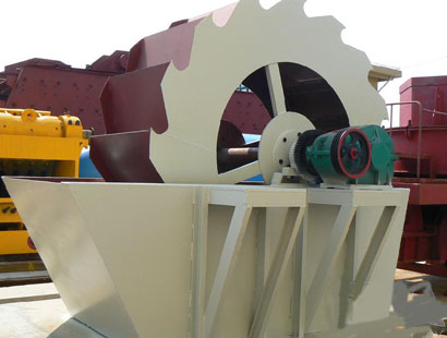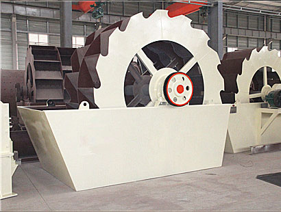 輪式洗砂機工作時,電機通過三角帶、減速機、齒輪減速后帶動葉輪緩慢轉動,砂石有給料槽進入洗槽中,在葉輪的帶動下翻滾,并互相研磨,除去覆蓋砂石表面的雜質,同時破壞包覆砂粒的水汽層,以利于脫水;同時加水,形成強大水流,及時將雜質及比重小的異物帶走,并從溢出口洗槽排出,完成清洗作用。干凈的砂石由葉片帶走,最后砂石從旋轉的葉輪倒入出料槽,完成砂石的清洗作用。