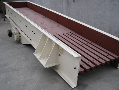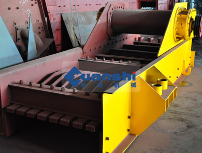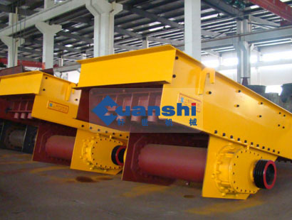 該機(jī)采用雙偏心軸激振器的結(jié)構(gòu)特點(diǎn),保證設(shè)備能承受大塊物料下落的沖擊, 給料能力大。在生產(chǎn)流程中可以把塊狀、顆粒狀物料從貯料倉(cāng)中均勻、定時(shí)、連續(xù)地給到受料裝置中去,從而防止受料裝置因進(jìn)料不均而產(chǎn)生死機(jī)的現(xiàn)象,延長(zhǎng)了設(shè)備使用壽命。給料機(jī)可分為鋼板結(jié)構(gòu)和篦條結(jié)構(gòu),鋼板結(jié)構(gòu)的給料機(jī)多用于砂石生產(chǎn)線(xiàn),將物料全部均勻地送入破碎設(shè)備;篦條結(jié)構(gòu)的給料機(jī)可對(duì)物料進(jìn)行粗篩分使系統(tǒng)在配制上更經(jīng)濟(jì)合理,在破碎篩分中已作為必不可少的設(shè)備。